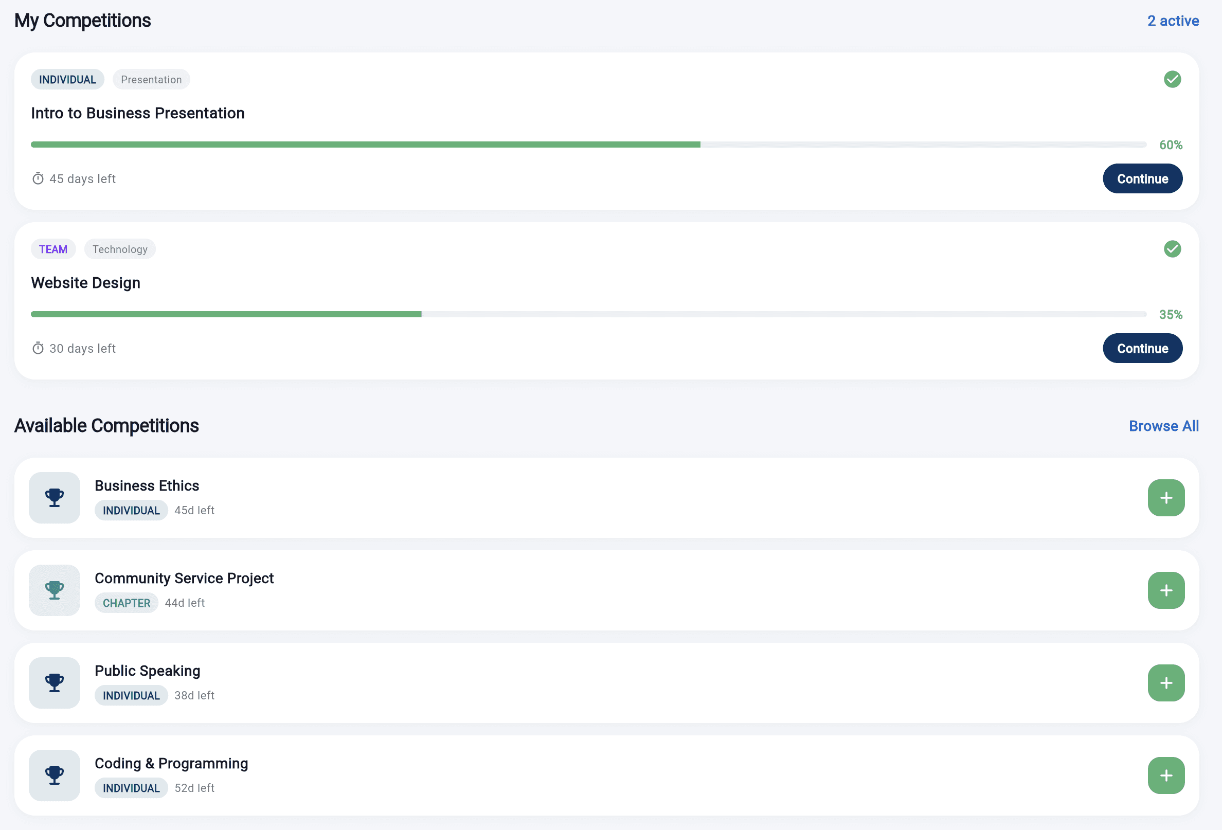 Track your progress for every competitive event — task completion, submission status, and advisor approvals all in one view