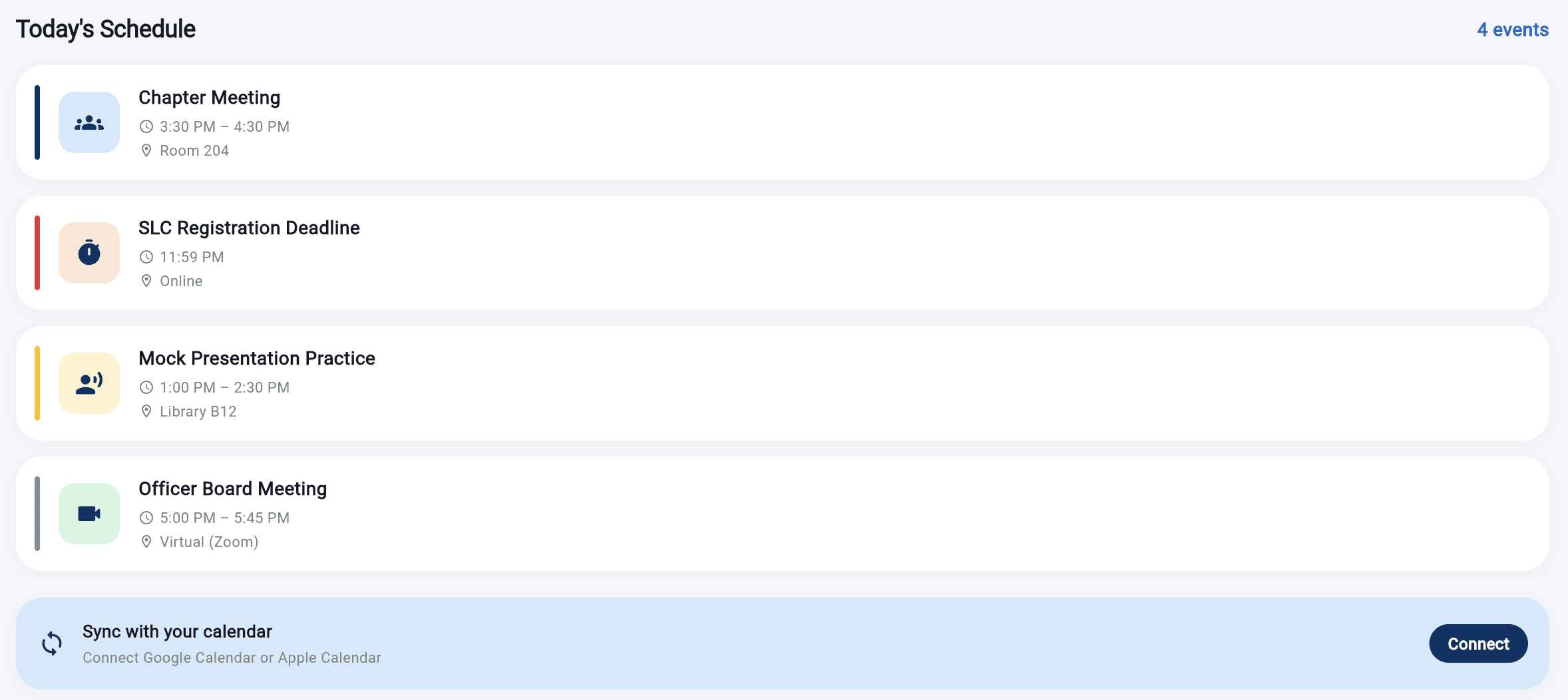 Communication, deadlines, resources, and competition materials are scattered across multiple platforms. Members, officers, and advisors all get the same information regardless of their role — leading to missed deadlines and confusion.